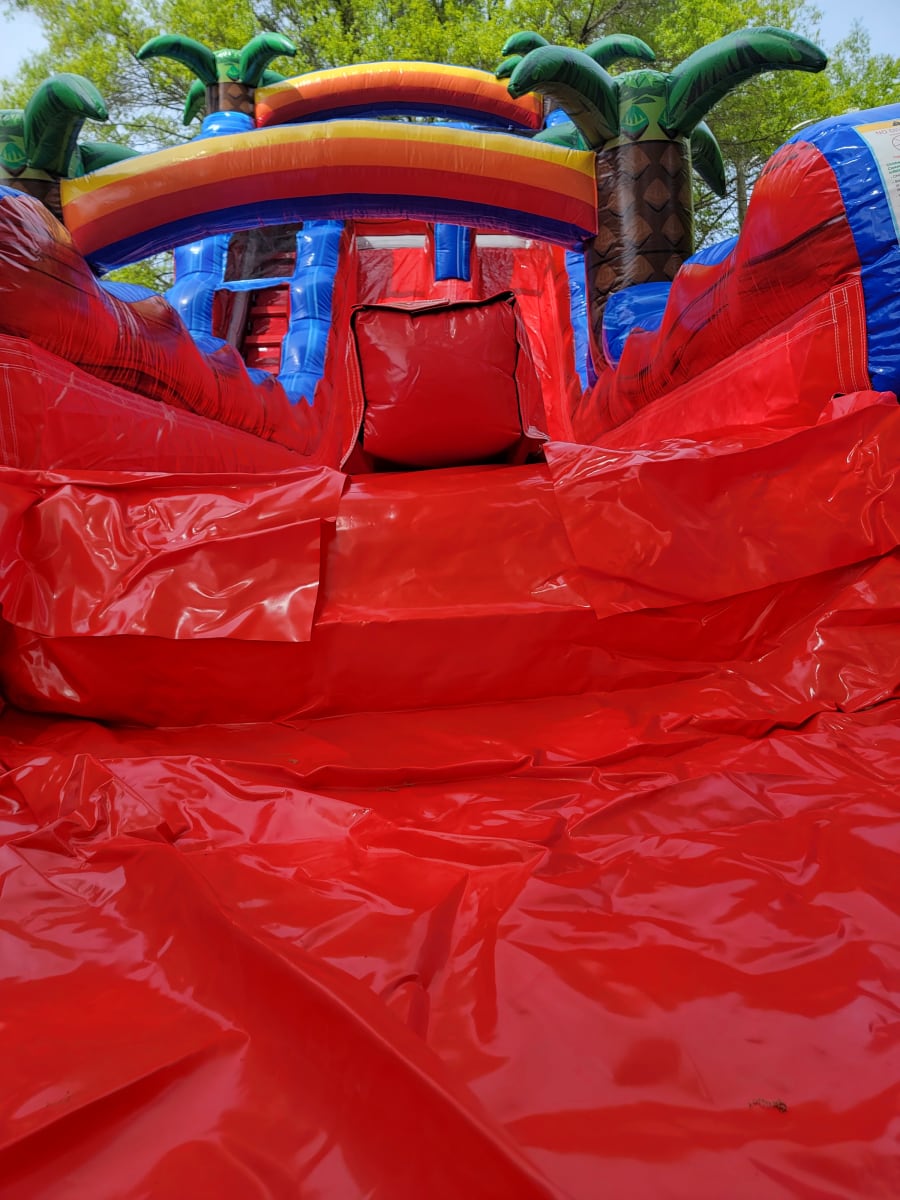 Our very own 18’ Double Lane Baja Blast water slide. This will be a great hit for the kids and parents. It has a center climb slide making it easier to climb. Both can race down the slide together. It is double lane and has a very large pool for everyone to splash around in at the bottom.