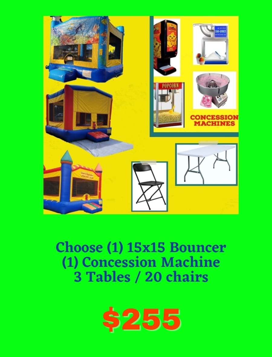 This package includes the 15X15 Dolphin Bouncer, 3 Tables, 20 Chairs and your choice of 1 concession machine. Enjoy a Day in the Sun With All of Your Friends and Family! your guests will have plenty of room to bounce and play the day away! Our Concession machines will provide the perfect treat! Our Tables and Chairs offer a place to relax! Recommended ages 3 - up.
